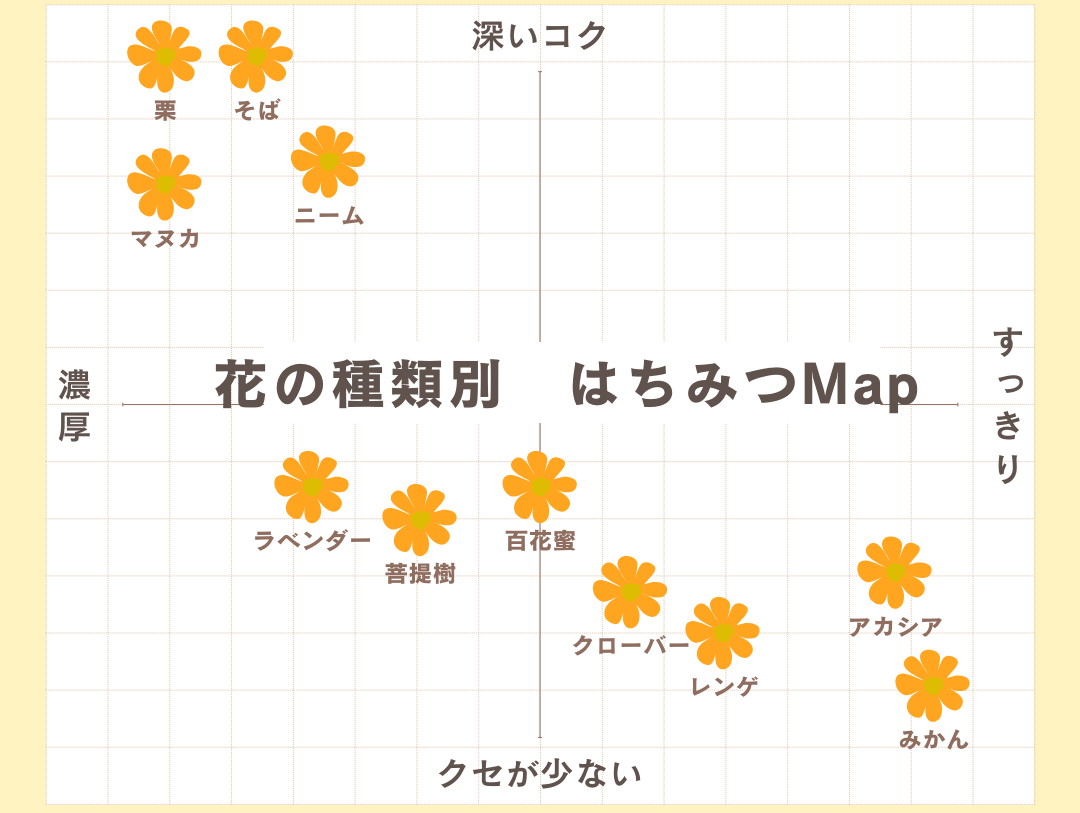 上のチャートを参考に、ご自身の好みや使いたい用途に合わせて、蜜源となる「花の種類」を選ぶのもおすすめです。ミツバチがどの花から蜜を集めてきたかによって、色・味・香りはもちろん、含まれる栄養素までが全く異なってくるからです。