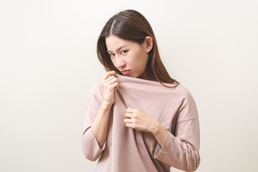 汗による水分や皮脂が肌に留まることで雑菌が繁殖し、臭いを発生させます。汗がたまるのを防ぐためには、吸汗速乾・通気性のある肌着の着用がおすすめです。