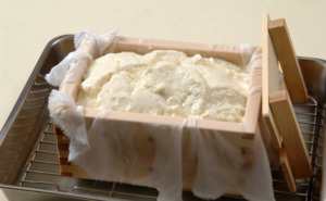 - 固まってきた豆腐を豆腐箱に流し込みます。