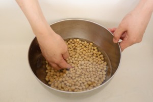 - 大豆を洗って、大豆の3倍くらいの水に一晩つけておく。