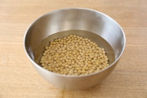 大豆を水に漬けておく