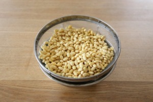- 大豆がしっかり戻ったら、ザルに上げて水気を切る。