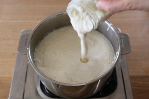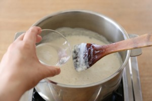 - あたためた豆乳に、溶いたにがりをゆっくりと入れます。この際、しゃもじなどににがりをかけながらゆっくりと流し入れましょう。