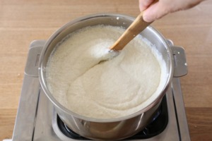 - ミキサーで滑らかになった大豆の汁(生呉)を鍋に移し、沸騰するまで焦げ付かない様に柄の長いしゃもじで静かにかき混ぜる。