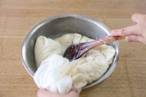 - 生呉の入ったこし布をヘラなどを使い絞ります。 この時のしぼり汁が豆乳です。冷めるとしぼりづらくなるので、温かいうちにやけどに気をつけながら 絞りましょう。