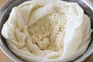 - 生呉を煮ている間に、ザルにこし布をセットして、 ボールの上に置いておきます。