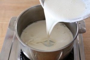 - 豆乳を鍋に入れ温めます。