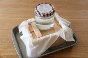 - 固まりつつある豆腐を豆腐箱に流し込んだら押し蓋をします。さらに水をいれたコップなどで重石をして水を切っていきます。(重石の重量で豆腐の硬さに違いがでます。軽量カップ100~200g程度の水を目安にしましょう。 おこのみの硬さになるまで、15分~30分程度重石をしておきます)