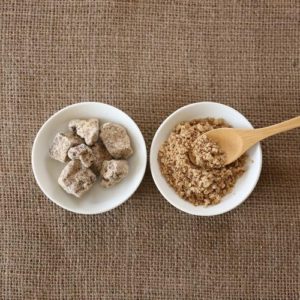 三温糖も先ほど述べたようにカラメル化させて結晶にした三温糖と、色を統一するためにカラメルを少しいれて茶色くしている商品があります。