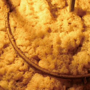 含蜜糖は、水に溶け込まないしぼりカスやゴミなどを細かいメッシュのフィルターに何回も通して取り除いて作ります。