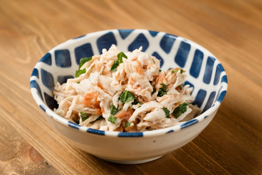 最後に紹介するのは、鶏むね肉を使ったさっぱり料理です。茹でた鶏むね肉を、叩いた梅干しとポン酢を合わせたソースで和えるだけの簡単レシピです。クエン酸とたんぱく質を手軽に補えるうえ、ポン酢と梅干しの酸味が合わさり、爽やかな後味になります。
