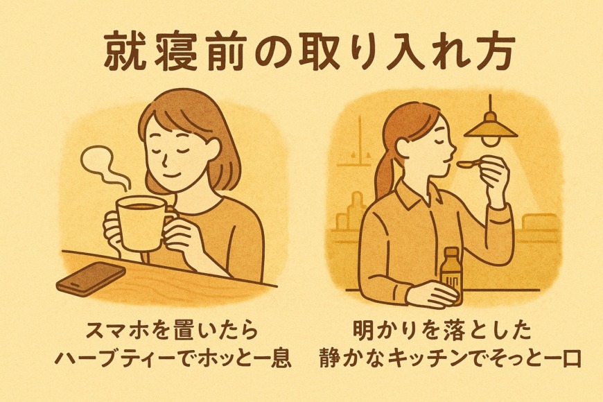 ゆっくりと舌先で転がすように味わえば、植物由来のほのかなナッツの香りが広がり、自然と心が落ち着いていきます。洗い物はスプーン1本だけ。忙しい日の夜でも、無理なく続けられる気軽な習慣です。
