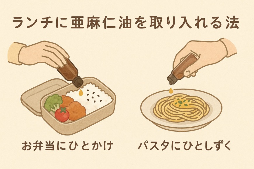 ここでは、「持ち運びやすさ」と「味の変化」をテーマに、ランチタイムに亜麻仁油を無理なく取り入れる方法をご紹介します。外食でもお弁当でも応用できるため、オフィスワーカーや学生にもぴったりのアイデアです。