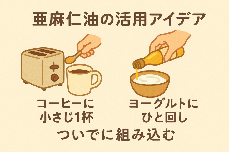 目的に合わせて、無理なく取り入れやすい時間帯を選んでください。「完璧なタイミング」ではなく「続けやすい仕組み」を意識するのがおすすめです。自分の生活スタイルに馴染ませれば、無理なく習慣化できます。もし独特の風味が気になるのであれば、亜麻仁油だけでなくえごま油も検討してみると良いでしょう。