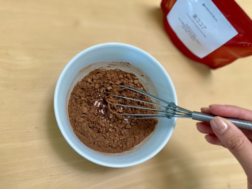 かわしま屋スタッフが、今回ご紹介したチョコレートソースを自社製品である「美ココア」で実際に作ってみました。