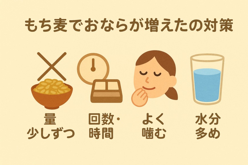 もち麦のβ-グルカンが消化が不十分なまま大腸に届くと、発酵が過剰に進んでガスが発生しやすくなります。これを防ぐには、一口につき30回以上を目安によく噛むことが重要です。