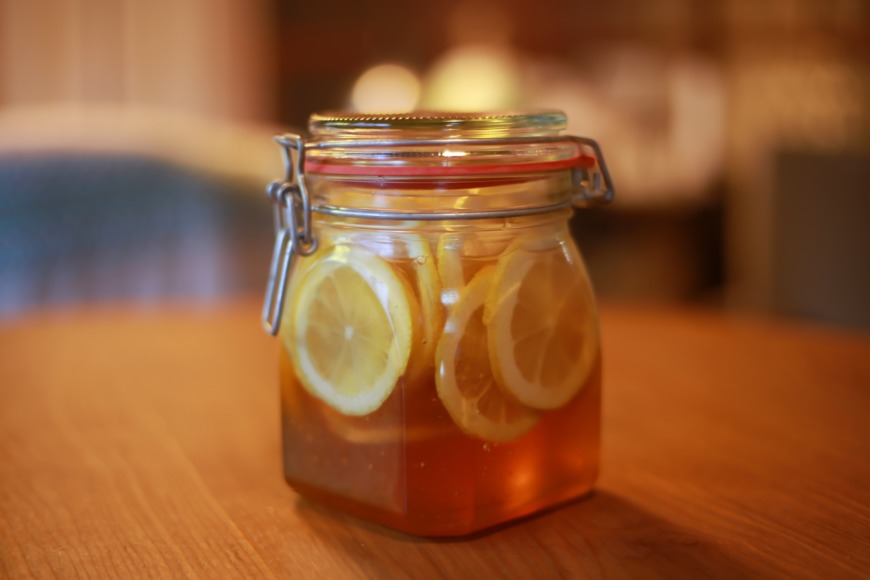 - 保存瓶にレモンを入れて、レモンが浸る量のはちみつを入れます。