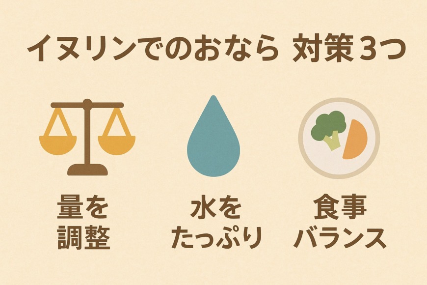 イヌリンを摂るとおならが増えてしまう悩みを解決するために、実践しやすい対策を3つ紹介します。