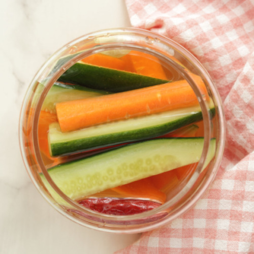 発酵が進んで酸味が強いコンブチャは、ピクルスにするとおいしくいただけます。野菜を漬けるだけなので簡単でヘルシーなのも嬉しい一品です。