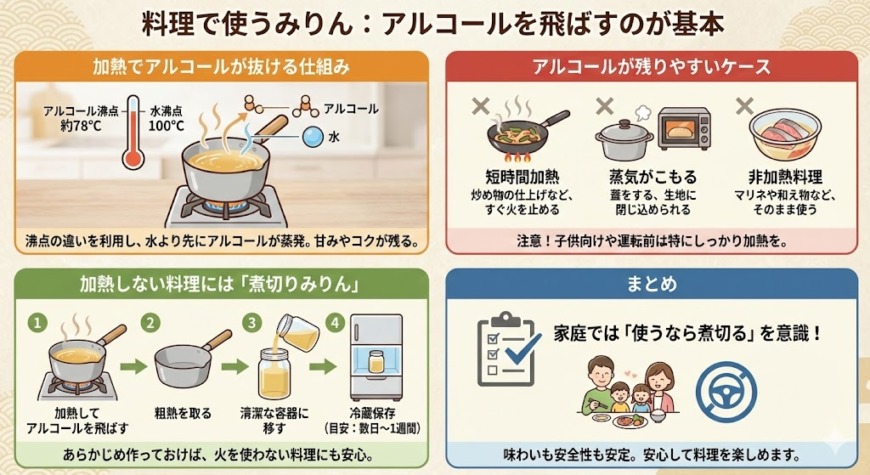 みりんを安心して使ううえでの基本は、アルコールをきちんと飛ばすことです。家庭では「使うなら煮切る」という感覚を持っておくと、味わいも安全性も安定します。