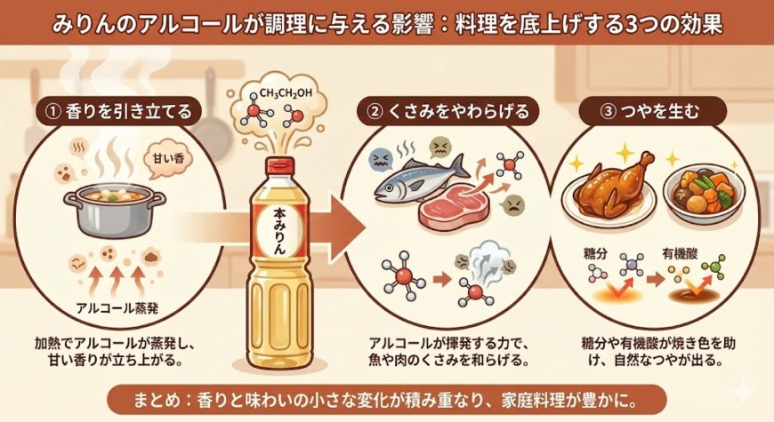 加熱するとアルコールはすっと蒸発し、みりんの甘い香りが立ちます。魚や肉のくさみが和らぐのも、アルコールが揮発する力のおかげです。