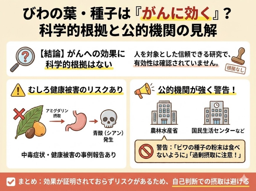 「びわの種子や葉ががんに効く」という説について、人を対象とした信頼できる科学的根拠は確認されていません。アミグダリンから生じる物質ががん細胞を攻撃するという考えに基づきますが、臨床研究で有効性は示されていないのが現状です。