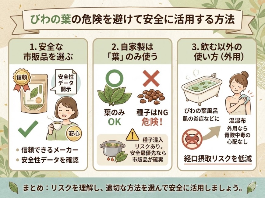 びわの葉や特に種子には危険性がありますが、リスクを理解し適切な方法を選べば安全に活用できます。危険な部位や利用法を避け、安全性が確保された方法を選択することが重要です。ここでは市販品の選び方、自家製の注意点、飲む以外の活用法を紹介します。
