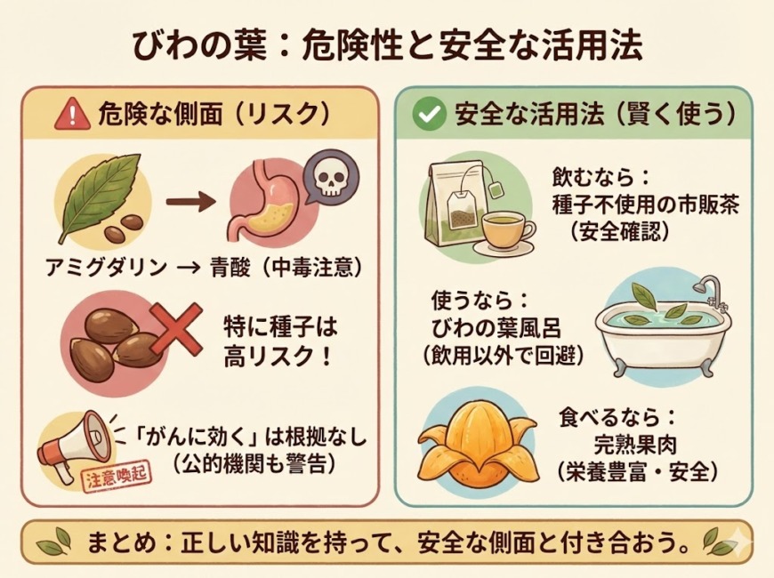 びわの葉や種子に含まれる「アミグダリン」は、体内で青酸を発生させ中毒症状を引き起こす可能性があり、特に「種子」はリスクが非常に高いです。「がんに効く」という情報に科学的根拠はなく、農林水産省なども注意喚起しています。