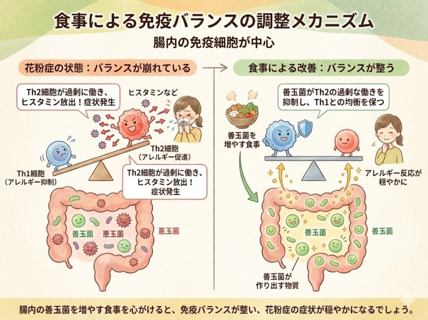 Th2細胞が優位になるとヒスタミンなどの放出が指令され、くしゃみや鼻水といった症状が引き起こされます。食事で腸内の善玉菌を増やすと、善玉菌が作り出す物質がTh2細胞の過剰な働きを抑え、Th1細胞との均衡を保つよう作用するとされています。