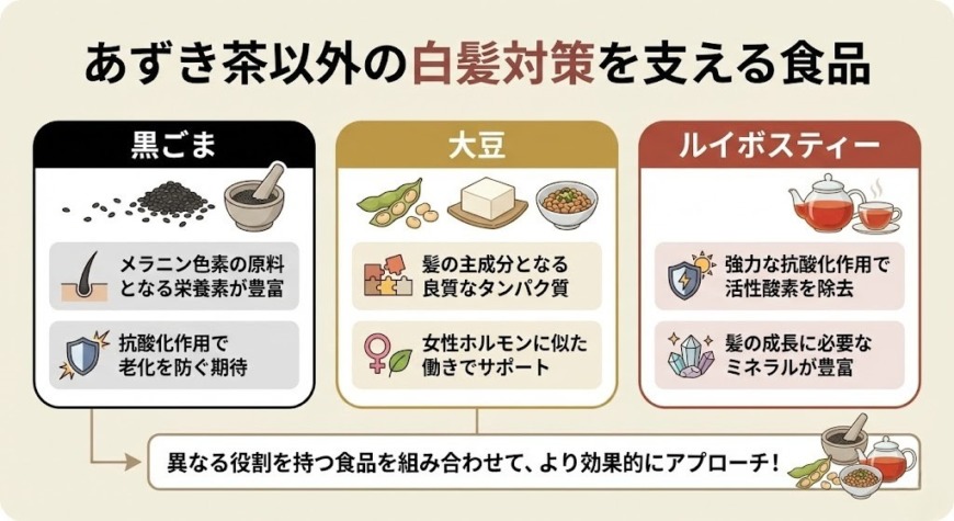 白髪対策を支える食品はあずき茶だけではありません。役割の異なる食品を組み合わせると、より効果的に白髪対策となる成分を摂取できます。具体的な食品は以下のとおりです。