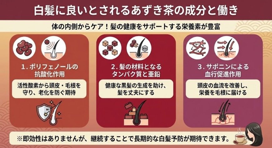 ここではあずき茶が白髪対策に期待される理由を、含まれる成分とその働きから解説します。
