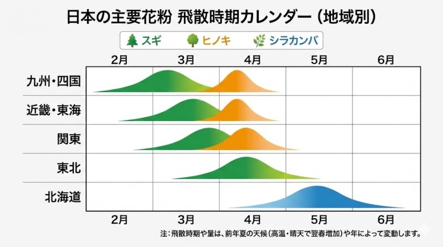 2月から始まるスギ花粉のシーズンも、地域差や前年の気象条件によって強さや期間が変わります。同じ日本でも、住む場所やその年の気候によって花粉症の様子は大きく異なるのです。