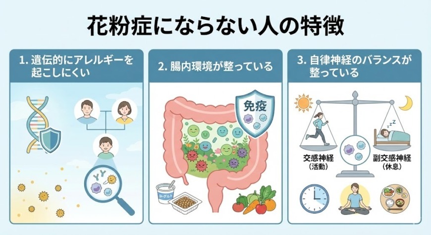 遺伝的にアレルギーを起こしにくい体質であることは、花粉症になりにくい理由のひとつです。