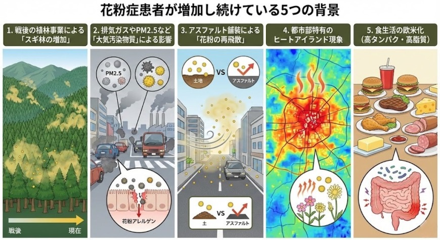 花粉症患者が年々増加している背景には、環境や生活習慣の変化が深く関わっています。主な要因を5つご紹介します。