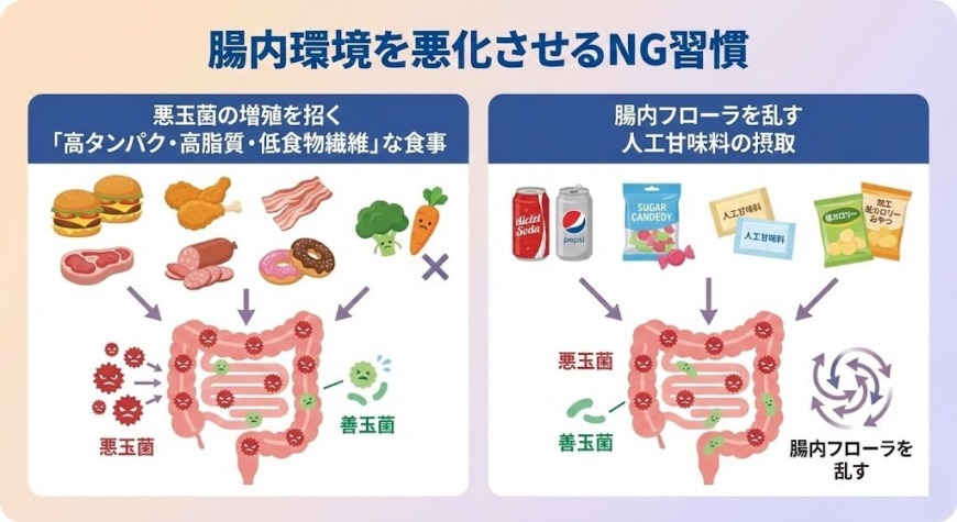 腸に良い食事と並行し、腸内環境を悪化させる習慣を避けることも重要です。