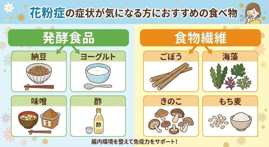 発酵食品とオリゴ糖や食物繊維を掛け合わせて、花粉症に耐えられる腸内環境を目指してみてください。