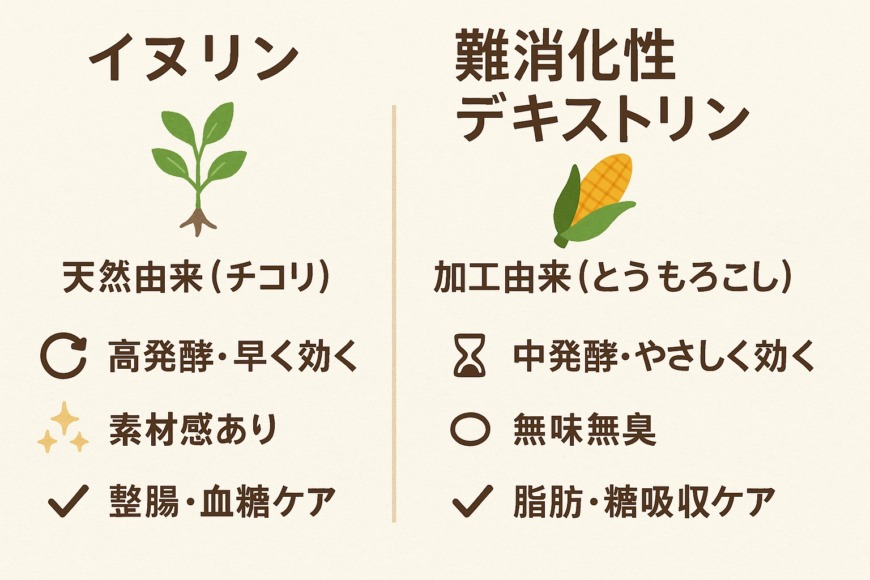 イヌリンは自然に近い製法と風味を持ち、難消化性デキストリンは高度に加工され、クセのない扱いやすさが魅力です。