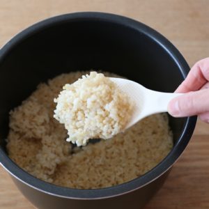水加減は玄米や炊飯器によって多少異なります。水分が少ないとボソボソとし、多過ぎるとベチャっとした食感になります。何度か炊いて自分の好みの水加減を見つけてみましょう。