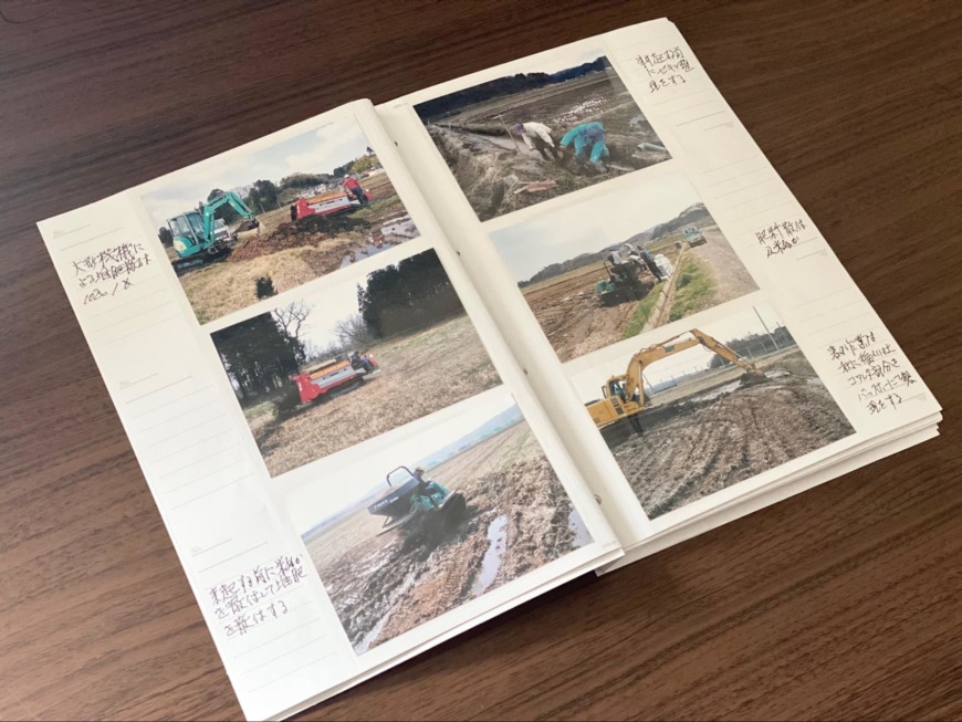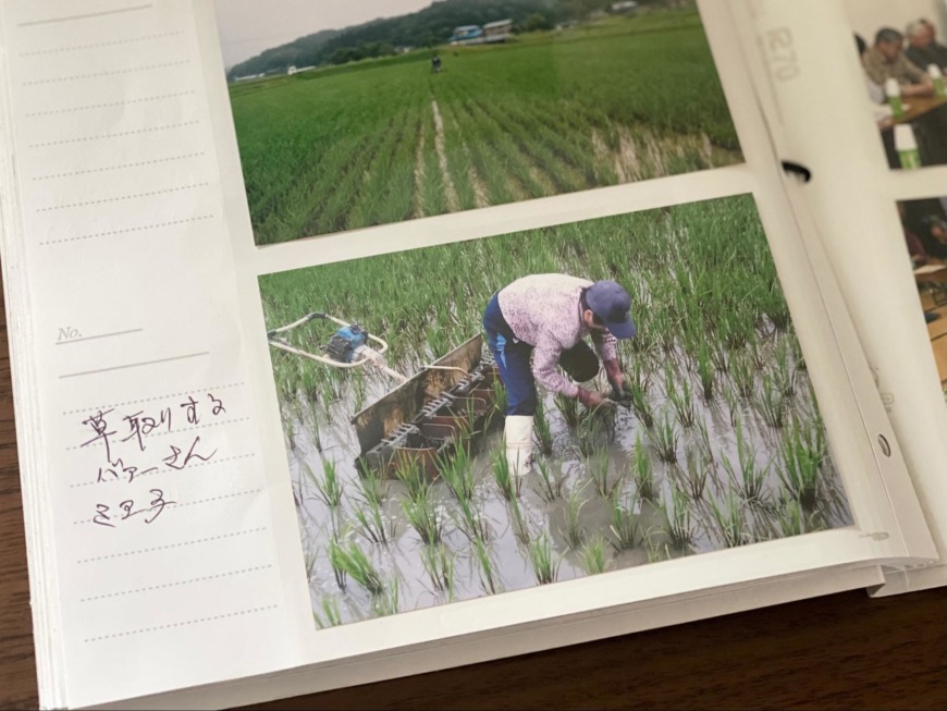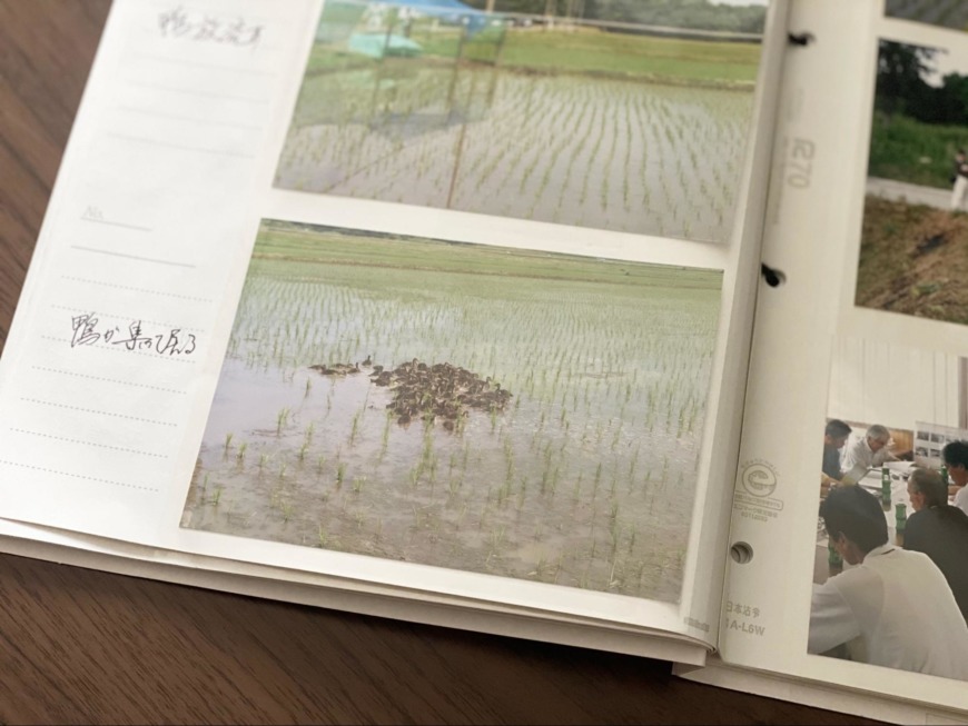 実際の作業の様子を撮影した写真をまとめたファイルを見せてくれました。田植え後は田んぼ毎に(先程ほどお話した)各農法で成育させます。