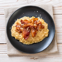 - 深めの耐熱ボウルを用意し、オートミール、ベーコン、豆乳、コンソメ、粉チーズ、塩コショウを入れ軽く混ぜ合わせる