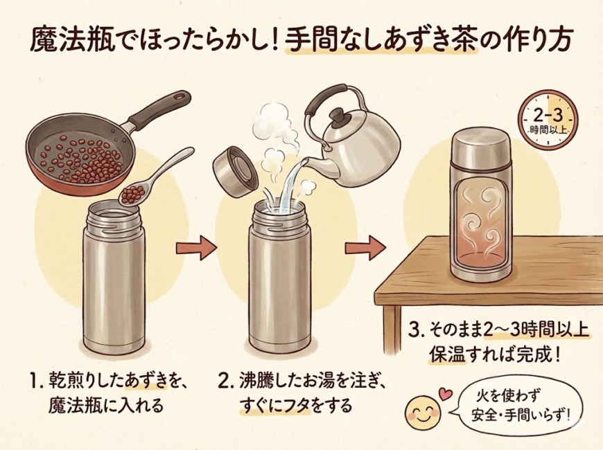 フライパンで乾煎りしたあずきを魔法瓶に入れ、沸騰したお湯を注ぎフタをします。そのまま2時間から3時間以上保温すれば完成です。
