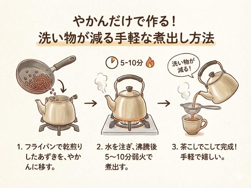 フライパンで乾煎りしたあずきをやかんに入れ、分量の水を注ぎ火にかけます。沸騰したら弱火で5分から10分煮出し、茶こしでこして完成です。