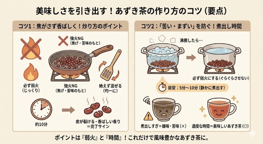 あずき茶を美味しく作るには、「炒り方」と「煮出し時間」にコツがあります。失敗を防ぎ、風味を引き出すポイントを解説します。