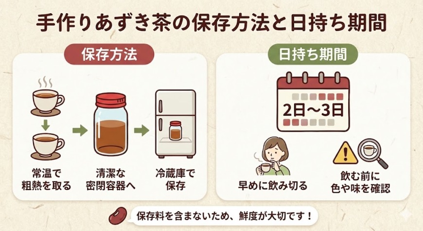手作りあずき茶は保存料を含まないため、常温で粗熱を取った後、清潔な密閉容器に入れて冷蔵庫で保存します。
