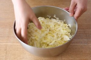 - 切ったキャベツをボウルに入れ、塩をまぶして軽く塩もみをし10分ほど置きます。