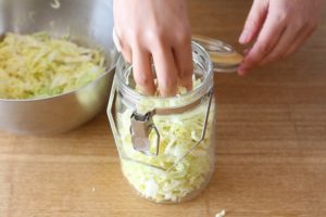 - キャベツを入れた容器に、キャベツが漬かるまで酢を注ぎ入れます。