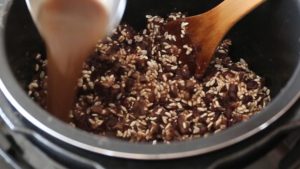 - 小豆が60度になったら米麹と混ぜ、茹で汁を少しずつ加えながら混ぜます。
