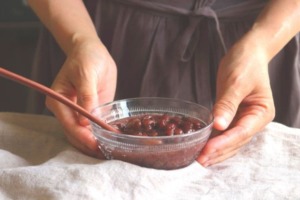完成した煮小豆は、容器に移して冷蔵庫で保存します。