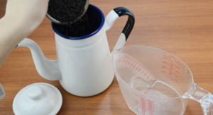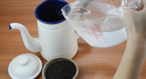 - 水を入れたやかんに、黒炒り玄米を入れます。 水100mlに対して、黒炒り玄米の量はおおさじ1が目安です。 お好みで水や黒炒り玄米の量を調節して下さい。