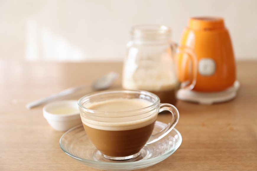 「ギー」特有のクセのある風味を緩和して、よりおいしくバターコーヒーを楽しむために独自の配合をしております。さらに「ギー」が低温になると固まってしまい使いづらい、という問題を解決するために、独自の攪拌技術で製造し、低温でも固まらない仕上がりになっております。